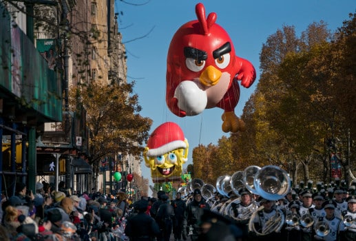 A balloon of Red, from Angry Birds, is followed by a Spongebob Squarepants balloon along Central Park West during the Macy’s Thanksgiving Day Parade in New York Thursday, Nov. 23, 2017. (AP Photo/Craig Ruttle)